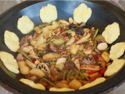 喜林苑柴火鸡,将散养的土鸡宰杀,剁块洗净备用。用纯净水加入二十多种调料炮制汤料,用时取适量加入土灶铁锅,灶膛加劈柴明火,汤沸后倒入鸡块、香菇、豆腐等焖煮。中间翻炒几遍,熟透后香味四溢。开锅加入洋葱、青椒等翻两勺,就着灶膛的熊熊柴火即可开饭。香菇提味,洋葱去腥,豆腐吃油,青椒增色,生熟相配,倍添鲜美。